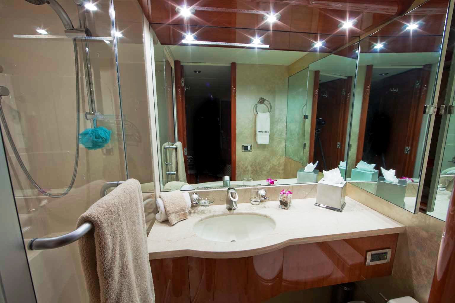 Each room has its own en suite bathroom with large shower and vanity area as well as a full entertainment set up. In the bow, forward of the galley there is a twin room with upper -under bunks and full en suite bathroom.