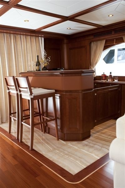 Her main deck features a comfortable and spacious salon with bar and an adjoining dining area. There is an opening to the exterior on three sides of the yacht providing a great connection and access to the water and the surrounding environment.