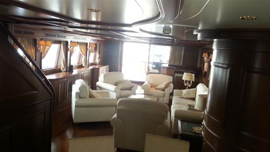 Yacht MARIA II OF LONDON’s interior boasts beautiful Cherrywood panelling and oak parquet floors throughout with white leather furnishings.