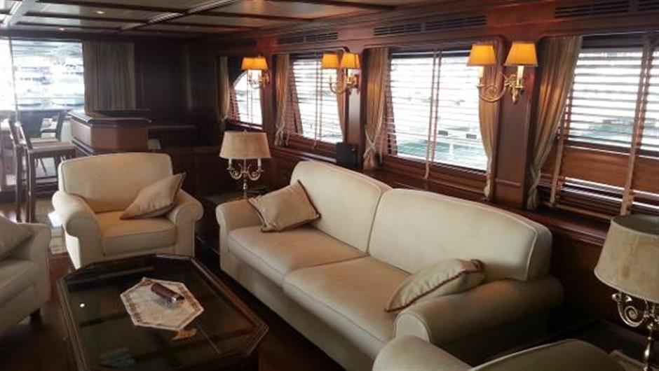 Yacht MARIA II OF LONDON’s interior boasts beautiful Cherrywood panelling and oak parquet floors throughout with white leather furnishings.