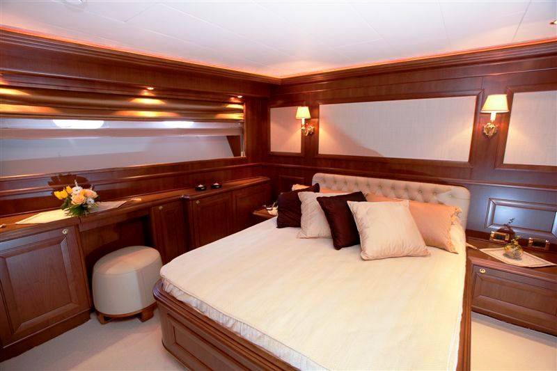 Her 4 cabins located on the lower deck consist of a Master cabin with a king size bed, dresser, office area, vanity and safe plus an ensuite bathroom with double sinks. There is a VIP double cabin with a queen size bed and dresser with an ensuite bathroom and two twin cabins that are convertible into double cabins.