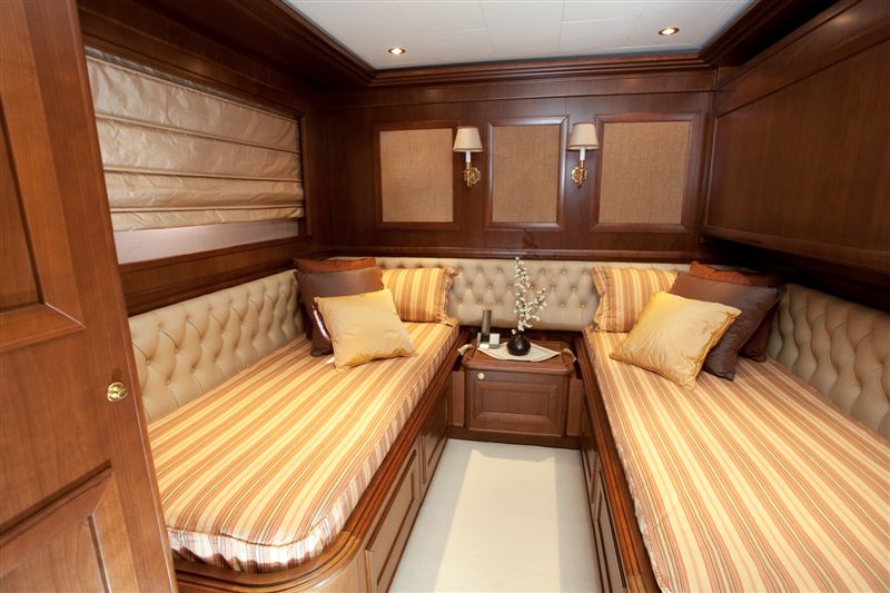 Her 4 cabins located on the lower deck consist of a Master cabin with a king size bed, dresser, office area, vanity and safe plus an ensuite bathroom with double sinks. There is a VIP double cabin with a queen size bed and dresser with an ensuite bathroom and two twin cabins that are convertible into double cabins.