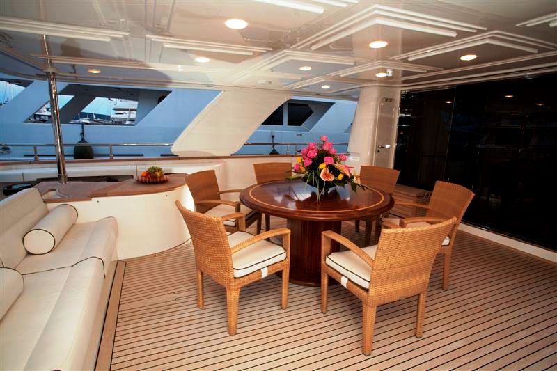 Luxury motor yacht MARIA II OF LONDON has equally impressive exterior spaces including a large aft deck with fixed seating to the aft and a dining table for al fresco dining.