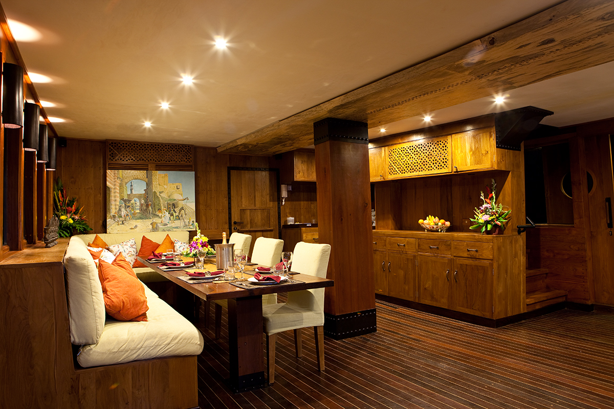 Her interior is beautiful with the handcrafted teak and ironwood complimented by crisp white couches and dining chairs along with splashes of vibrant colour.