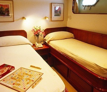 Australia Luxury motor yacht Huntress offers charter guests elegant and luxurious accommodation for six in three cabins including a master stateroom with a queen sized bed, a TV, DVD and a his and hers bathroom with Spa Pool and two twin cabins with a TV and VCR as well as an ensuite shower.