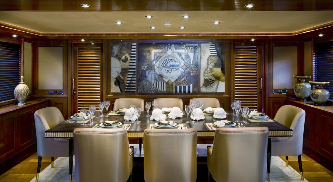 The interior has elegant linear Art Deco motifs and features Canaletto walnut and a light-hued, natural cherry wood. Parquet flooring interspersed with ample inlays of silk carpeting adds a unique touch to the interior.