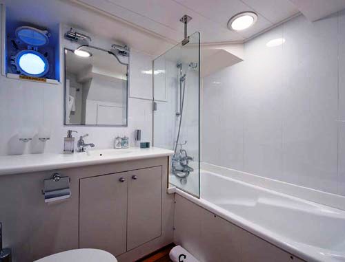 The remaining cabins situated on the lower deck include a VIP Stateroom with a Queen size bed and en-suite Bathroom, two Double Staterooms with an en-suite with Shower room, an additional Double cabin with an en-suite Shower room and a Sofa/Bed, convenient for families with a child and a Twin Cabin with an en-suite Shower room.
