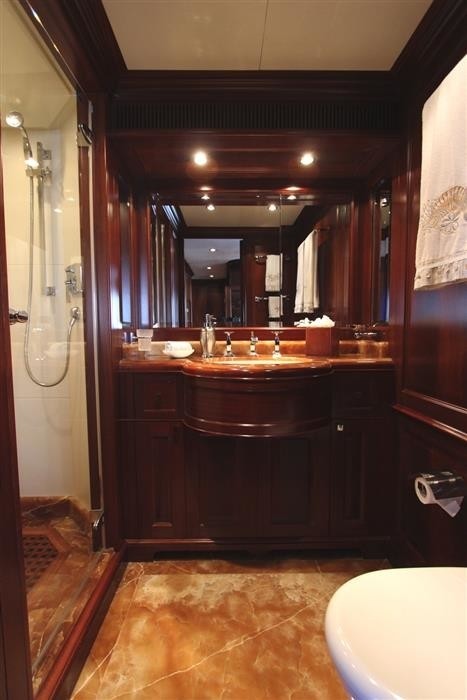 ANDIAMO can accommodate up to 10 guests in 5 cabins. Her Master Cabin is located on the main deck with an en-suite bathroom with shower and twin hand basin. The remaining cabins on the lower deck include two Double VIP guest cabins with ensuite shower and two twin guest cabins with Pullman beds and en-suite shower.