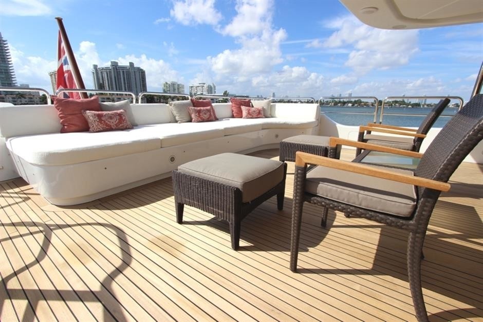 Her full beam master cabin features a king-sized bed and boasts 180° panoramic views surrounded by the lavish decor. The Master cabin also features a study, a walk-in wardrobe, a large plasma screen and a dark velvet chaise-longue. The ensuite bathroom is decorated in warm honey coloured onyx with dark wooden finishings.