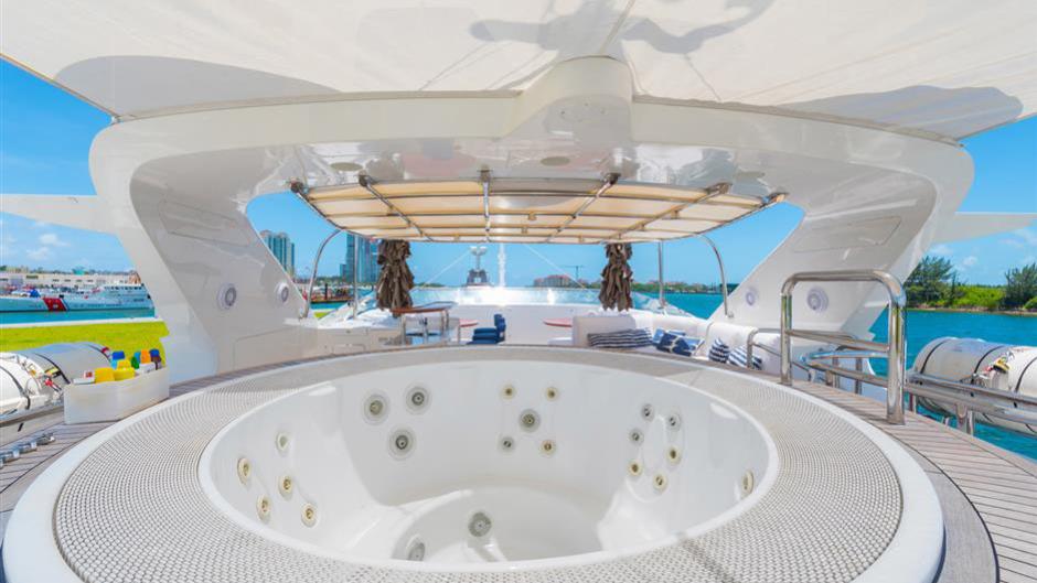 The sky lounge is inviting with an onyx-top and leather finished bar, comfortable Frau Sofas, a games table with a carved wooden chess board and a retractable plasma TV. The room creates an informal yet distinguished atmosphere. Leading from the sky lounge aft is the upper deck which is a great area to dine al fresco.