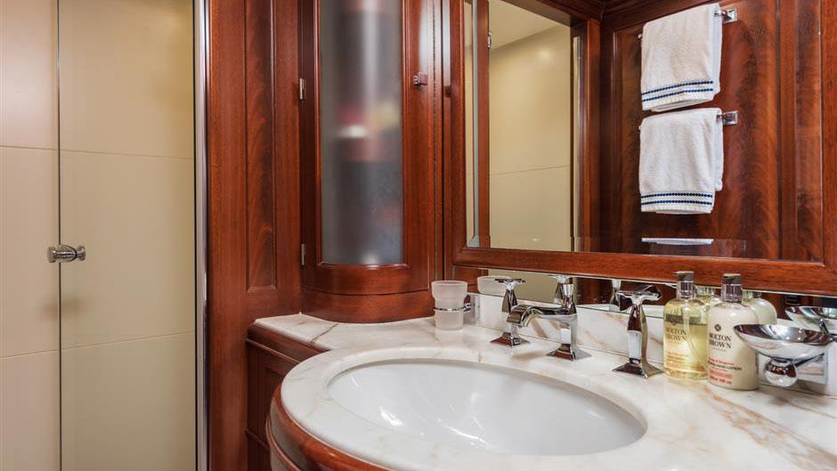 The ensuite bathroom is decorated in warm honey coloured onyx with dark wooden finishings. The remaining cabins are located on the lower deck and include a VIP cabin decorated in warm mahogany and soft cream furnishings with a large double bed and en-suite bathroom. A double cabin and two twin cabins with Pullman beds are also situated below.