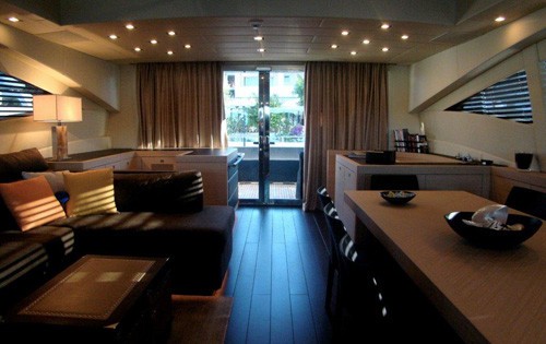 The salon has comfortable seating to starboard with a formal dining table to port. The salon also has a bar, entertainment system and it is possible to watch the captain expertly manoeuvre the yacht from his helm station.