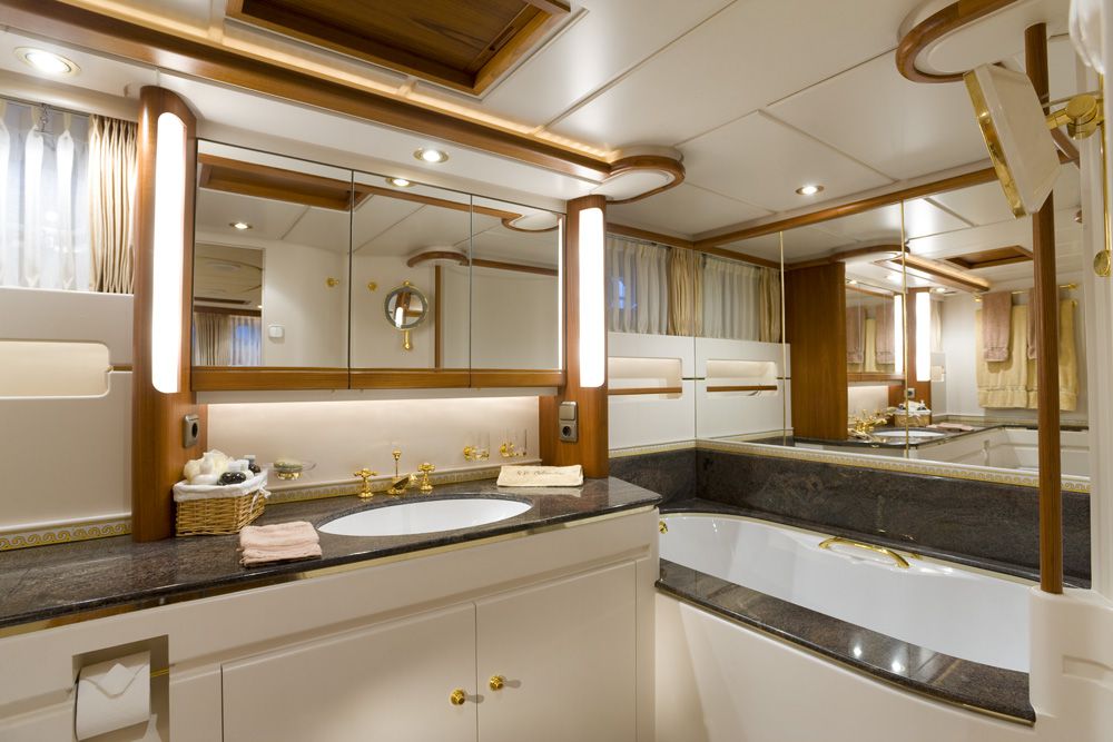 Her main salon has a large dining table, a TV set with an A/V entertainment system, and a seating area.