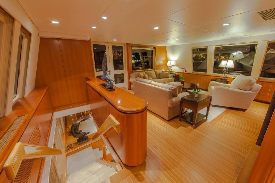 Two identical queen sized guest staterooms with ensuite marble bathrooms with showers are also located below deck and a fourth stateroom with queen berth and ensuite facilities is located on the main deck forward.