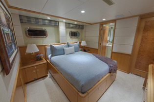 Motor yacht LOOSE ENDS is able to accommodate up to 8 guests in 4 double cabins including a full beam Master Cabin, located below deck amidship, with king size berth, walk-in closet, settee, and his and her marble bathroom with Spa Pool tub.