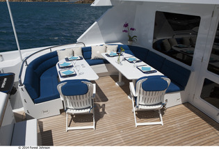 The main salon features comfortable seating, a bar and further forward there is a dining table for up to 8 guests. It is also possible to dine al fresco on the aft deck or enjoy a causal BBQ on the sundeck after a relaxing soak in the Spa Pool.