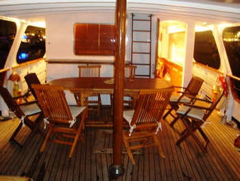It is possible to dine outside on the aft deck with teak deck furniture. On the upper deck, she provides space with loungers, sofas and armchairs and large amounts of deck space for sunbathing.