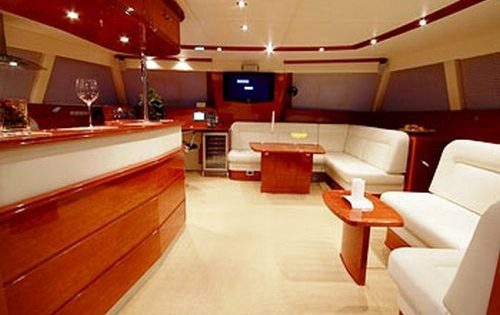 Her main salon features two large leather couches, one with a coffee table and the other with a dining table forward. There is also a bar / galley area to port.