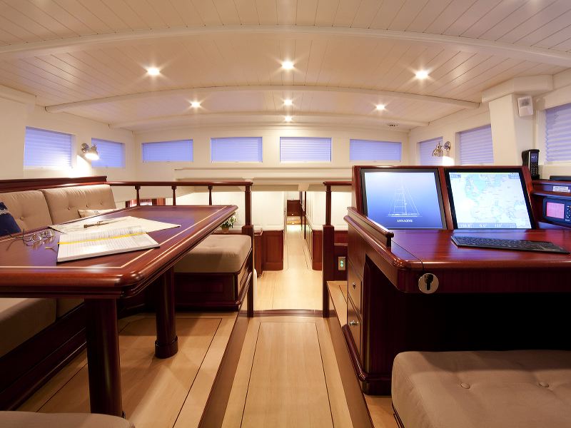 To the aft, the shaded cockpit is ideal for alfresco dining in the fresh air and seating along the stern provides an additional space for guests to observe the changing scenery.