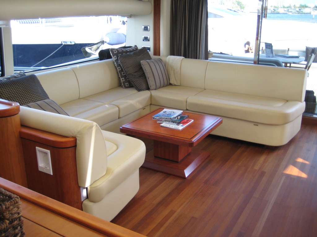 Inside the deck salon of yacht NO COMPROMISE, living space is large and lavish. Home comforts of soft settees and a separate dining area make relaxing and socializing easy.