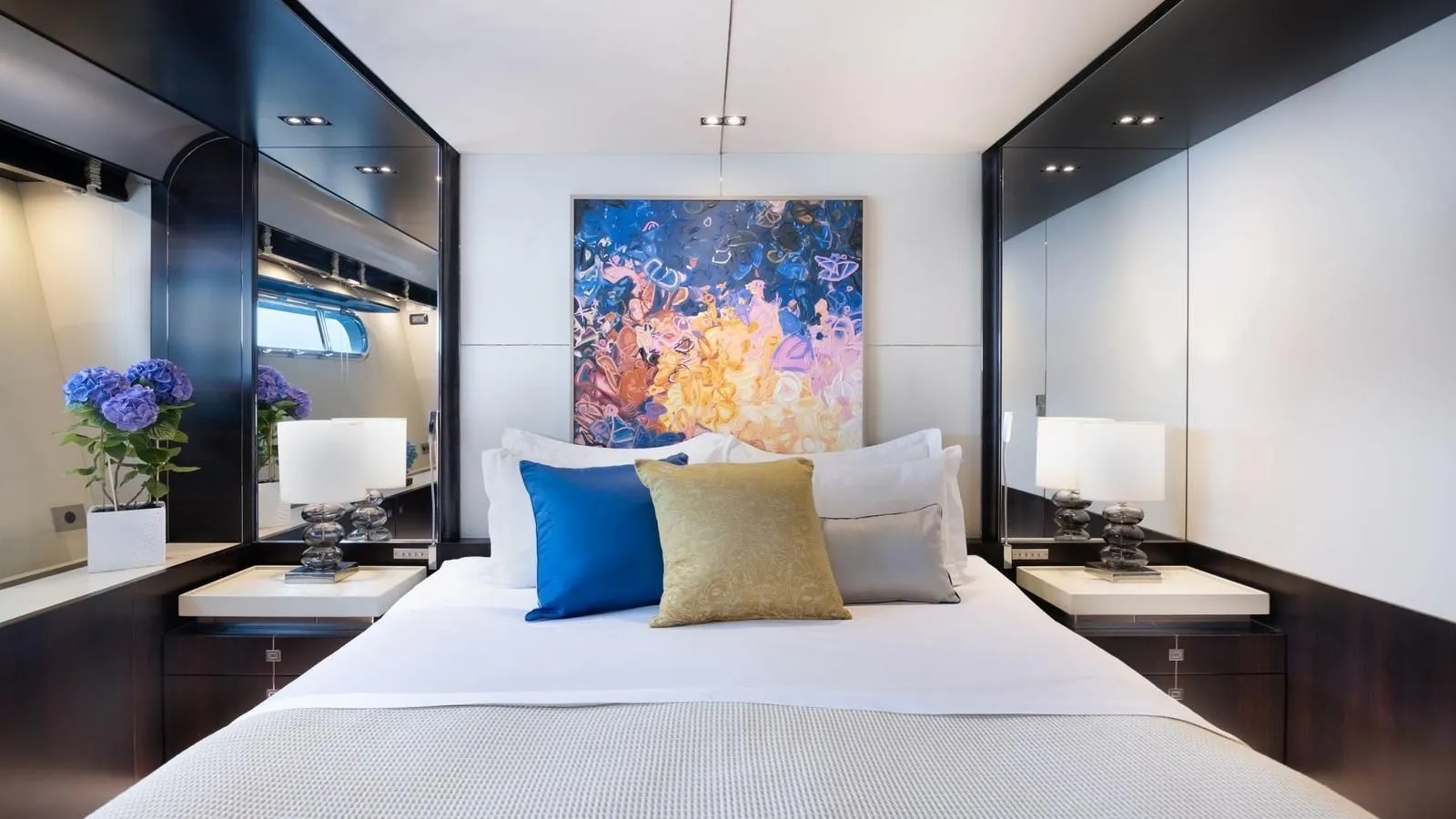 All of the cabins are located on the lower deck and consist of a full-width Master Cabin with King Size bed, separate settee area and bathroom en-suite, a VIP cabin with Queen Size bed and bathroom en-suite, a Double cabin with ...