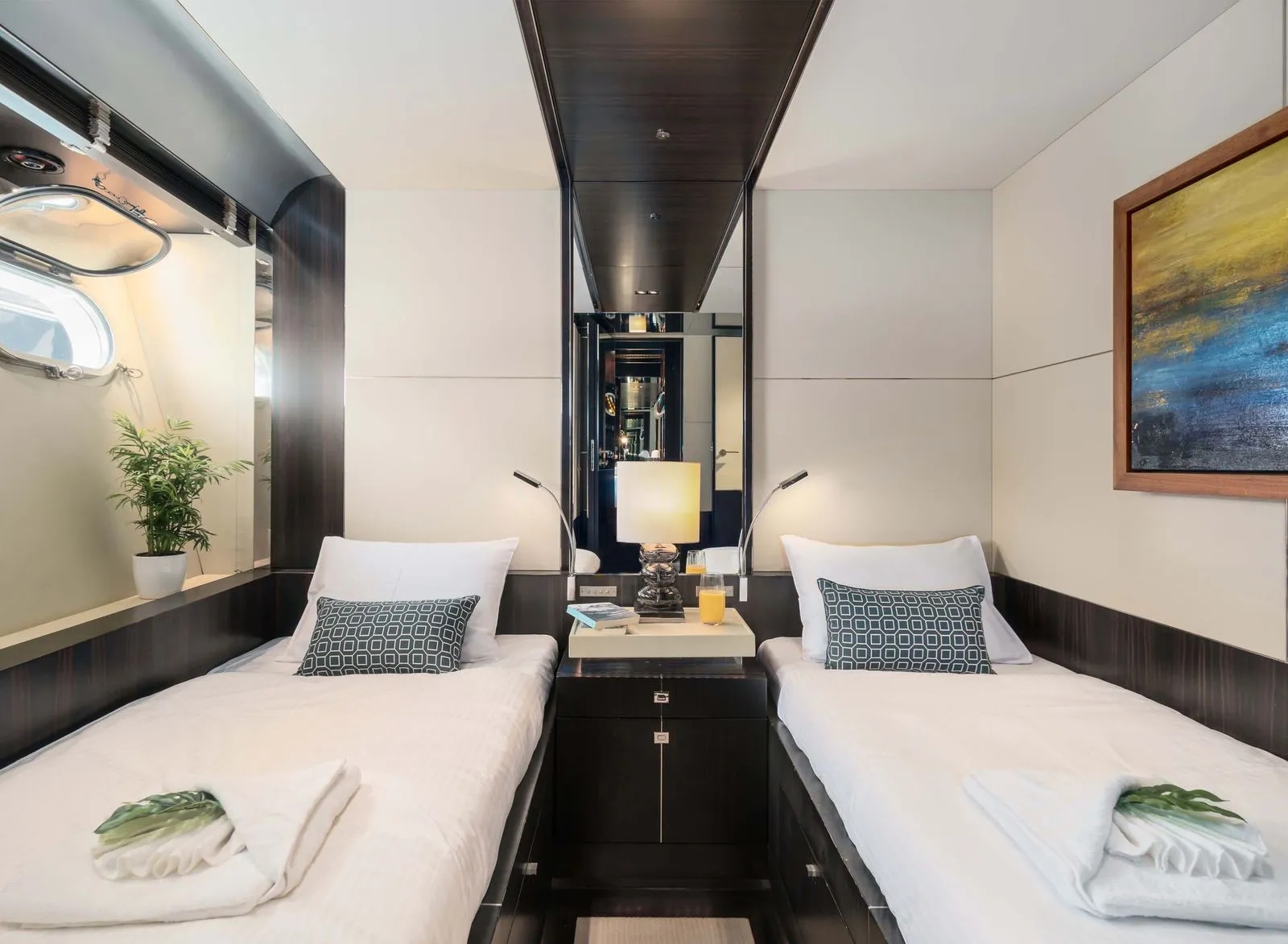 All of the cabins are located on the lower deck and consist of a full-width Master Cabin with King Size bed, separate settee area and bathroom en-suite, a VIP cabin with Queen Size bed and bathroom en-suite, a Double cabin with ...