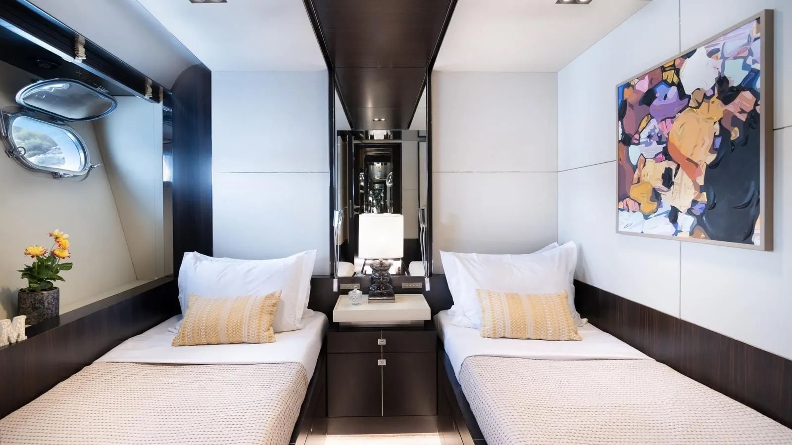 All of the cabins are located on the lower deck and consist of a full-width Master Cabin with King Size bed, separate settee area and bathroom en-suite, a VIP cabin with Queen Size bed and bathroom en-suite, a Double cabin with ...