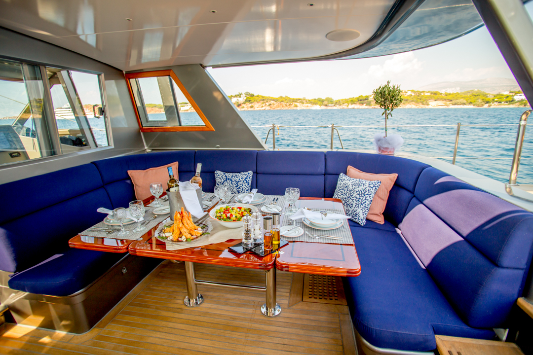 Dinner can be served comfortably for twelve in her semi-enclosed deck saloon, sheltered from either sun or spray and cocktails can be enjoyed under sail from around her aft steering helm ‘wet bar’ with an extensive padded ...