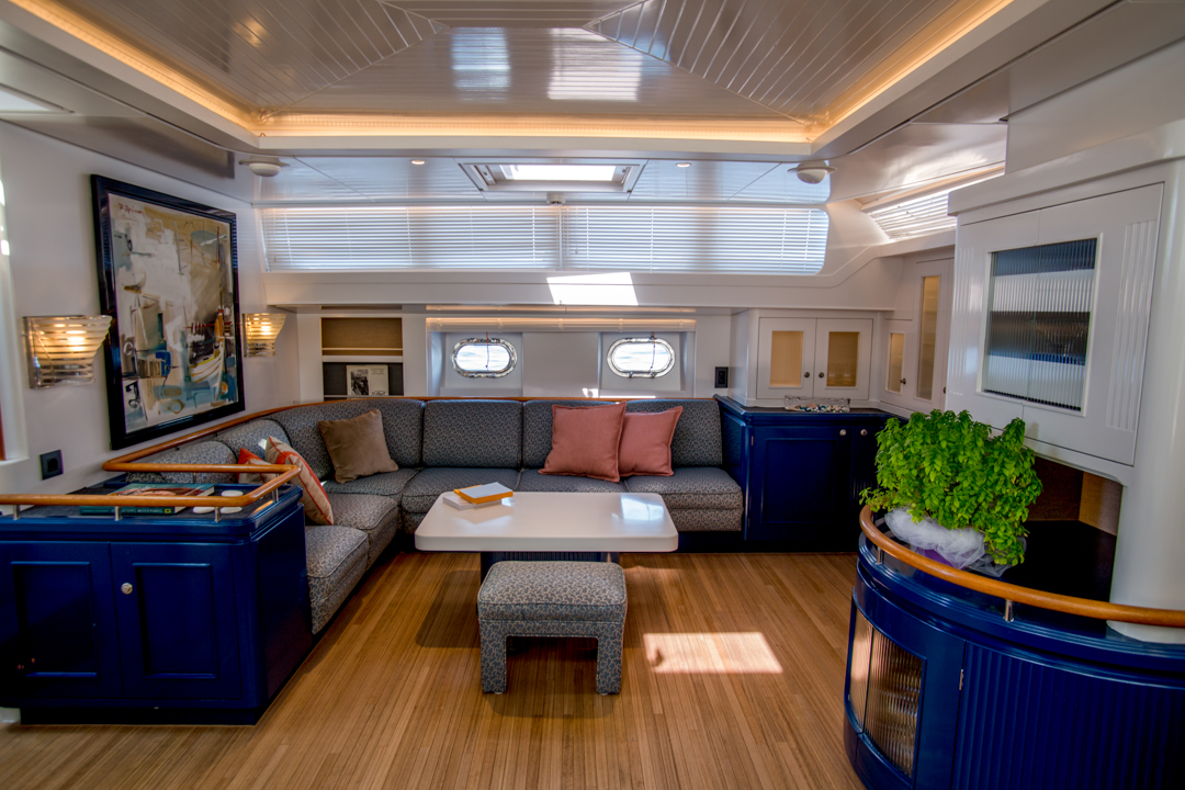 Dinner can be served comfortably for twelve in her semi-enclosed deck saloon, sheltered from either sun or spray and cocktails can be enjoyed under sail from around her aft steering helm ‘wet bar’ with an extensive padded ...