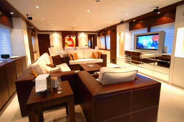 She features a modern and comfortable salon a bar to starboard upon entry with brown leather couches surrounding a low coffee table facing the LCD TV.