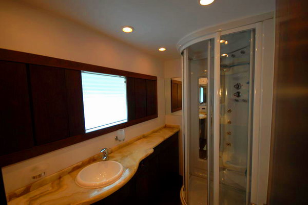 Forward of the salon seating area is the formal dining area. The aft deck features an al fresco dining table with access to the swim platform and a staircase on the port side leading to the flybridge. The top deck is a ...