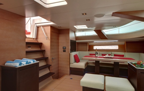 Sloop AMAZON CREEK features a modern salon with comfortable couches with a coffee table to starboard and a dining area to port. The large cockpit area above features twin wheels and an al fresco dining area with a bimini shade.