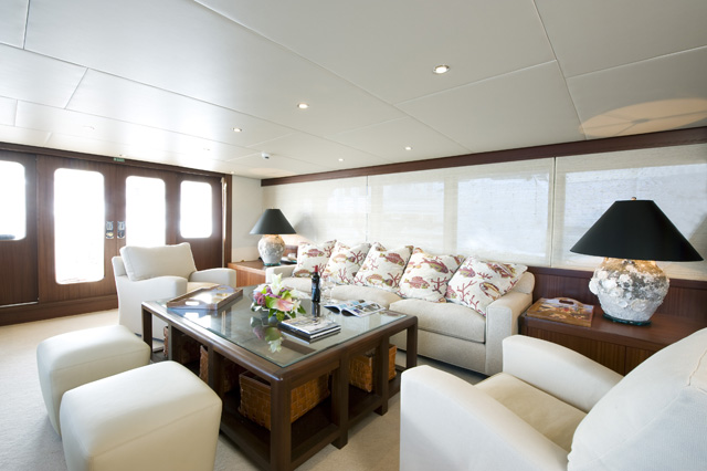 The salon is an open plan, with a generous lounge aft, boasting ample plush seating and coffee table. Forward, the formal dining table seats 8 guests easily. The lounge is surrounded by panoramic windows, while the formal dining area has large round ports, creating an intimate atmosphere.