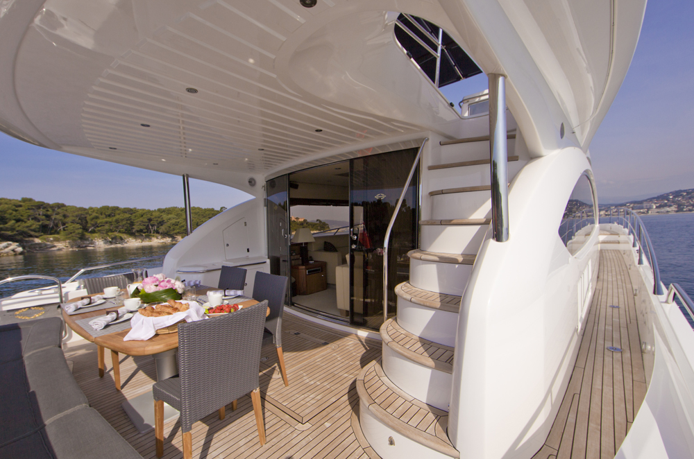 Out on deck there are comfortable areas for the guests to relax including the fly-bridge that provides a great area to dine al fresco, fully equipped with grill and bar - most of which is covered by a retractable bimini canvas.