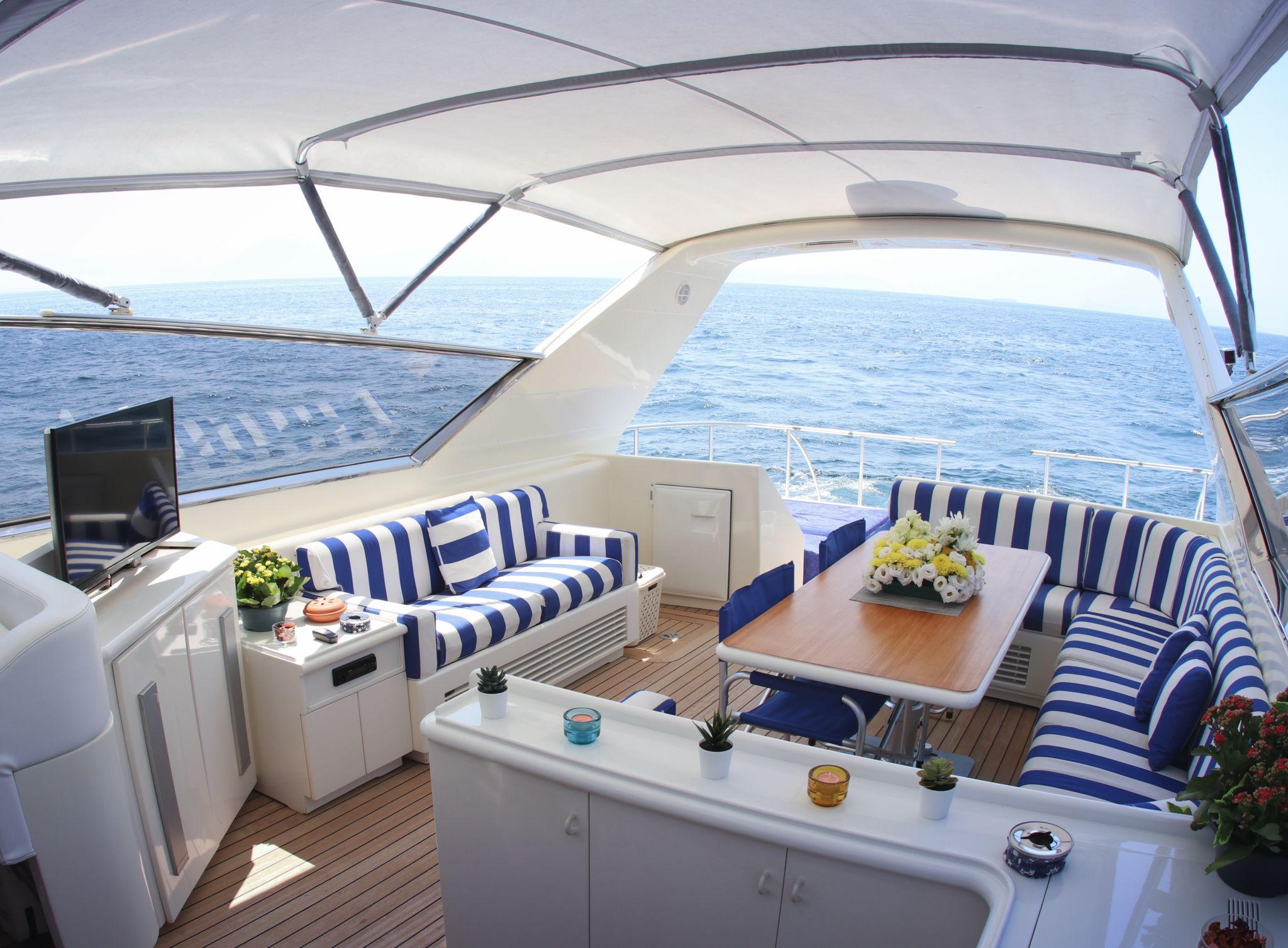 Forward is the helm station, aft of the helm to port is an alfresco dining option that seats all the guests comfortably and there is a lounge sofa to starboard with a pop up flat screen TV. Aft of the outdoor salon 2 large ...