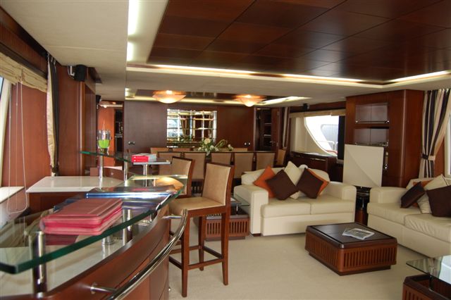 Her main salon accessed via double glass door from the aft deck features comfortable couches arranged in a U shaped, facing the large Flat screen TV. There is a bar to port and a dining area forward of the salon. Further forward there is a media centre room with a large home theatre system and couches.