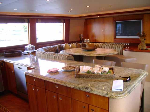 M/Y CARBON COPY (ex New Moon II) has a luxurious salon offering fantastic views from large windows to port and starboard. The salon features a large sofa and cocktail table to starboard as well as a game table and bar on the port side. Forward of the salon is the dining area ideal for formal or family dining.