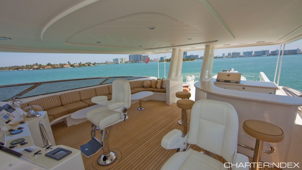 This motor yacht boasts an oversized aft deck with alfresco dining for twelve guests as well as a built-in wet bar with entertainment centre to port. The fly bridge features a custom hard top, a bar, a Spa Pool and lounge seating.