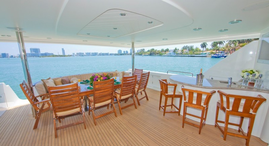 This motor yacht boasts an oversized aft deck with alfresco dining for twelve guests as well as a built-in wet bar with entertainment centre to port. The fly bridge features a custom hard top, a bar, a Spa Pool and lounge seating.