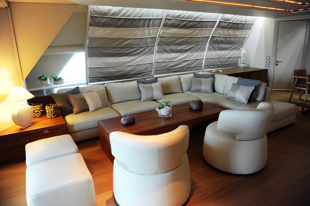 The main salon of M/Y ROSPIYA is accessed via the aft deck by a double sliding door that is completely recessed.