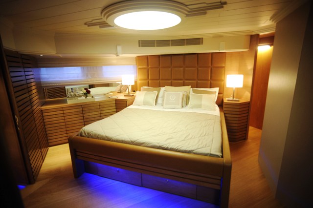 The Master Cabin is located on the lower deck, provides en-suite bathroom with separate shower cabin and hot tub, office, and walk-in wardrobe. The King size bed can be raised remotely at both the head and feet.