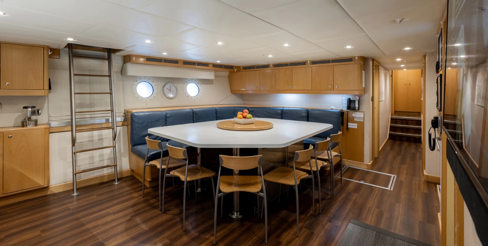 The upper deck aft is designed for outdoor dining and lounging, placing the circular alfresco dining table near the skylounge doors for easy access between the two areas.