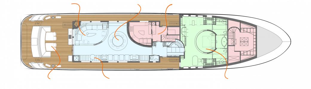 Two double cabins and two VIP cabins can be found on the upper deck, fitted with large windows in both the rooms as well as bathrooms. The two VIP cabins offer direct access to the outside. Tenders & Toys: