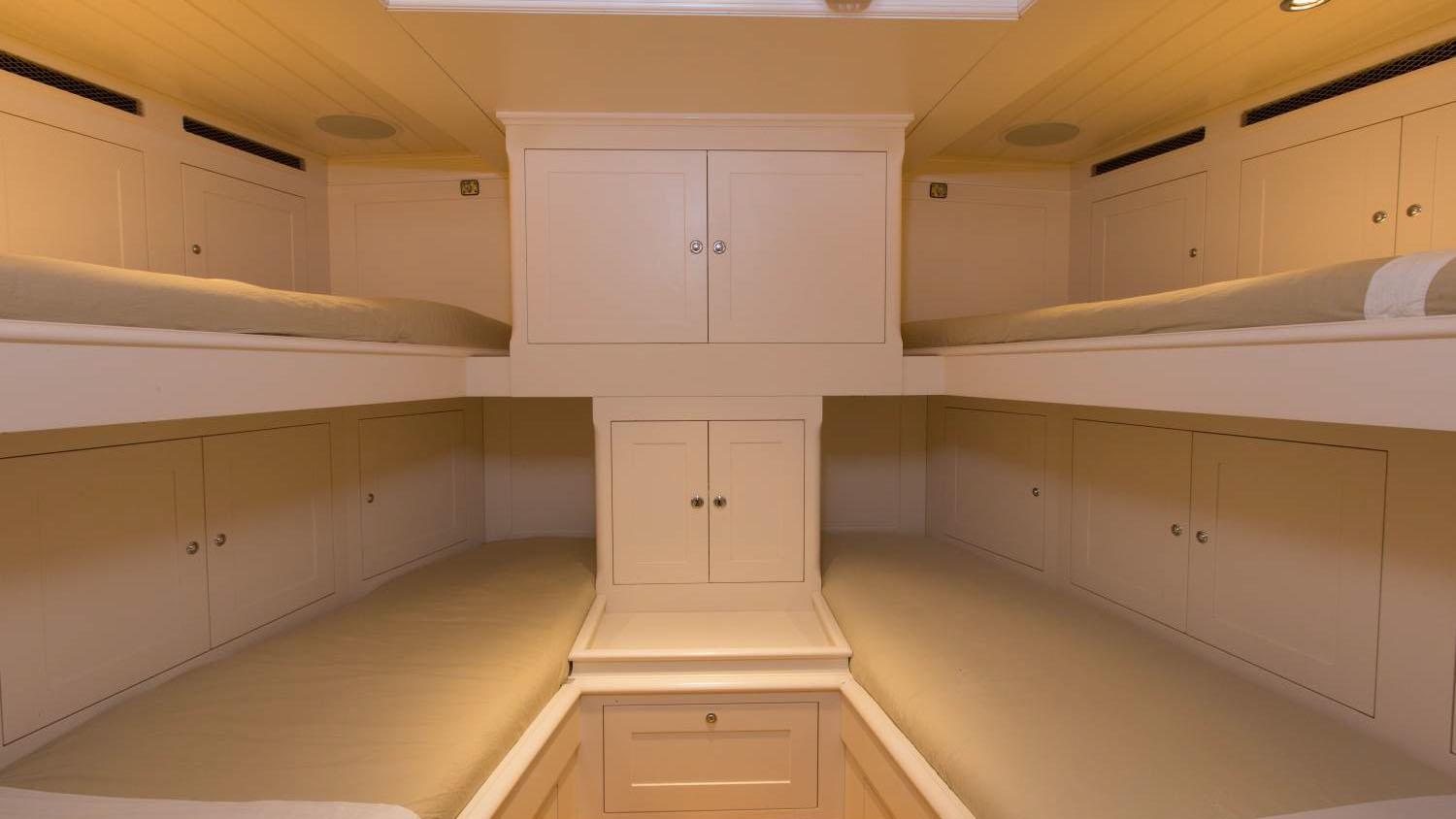 The owner’s stateroom is aft, and there are two ensuite twin guest cabins, each with a Pullman berth.