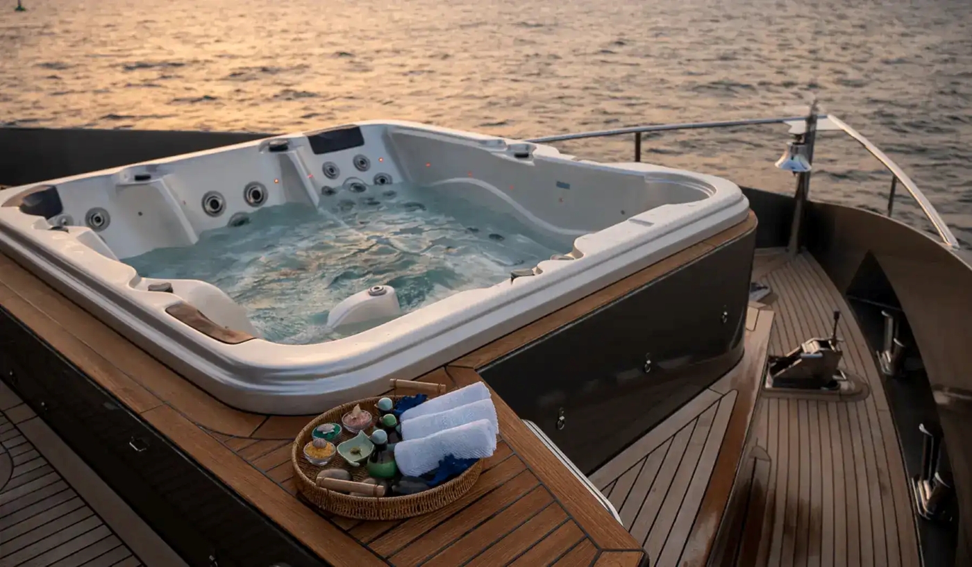 NOTABLE FEATURES OF SANTORINI YACHT: ~ spacious accommodation ~ ensuite staterooms ~ on-deck master suite ~ great exterior deck areas ~ Jacuzzi ~ gym equipment ~ air-conditioning ~ WiFi ~ at anchor ...