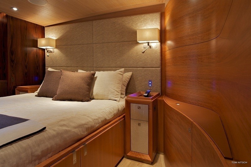 She is able to accommodate up to 8 guests in a Master suite, 2 double cabins (1 of which is convertible into an office), a children’s cabin which has 3 berths, plus a single Nanny’s cabin.