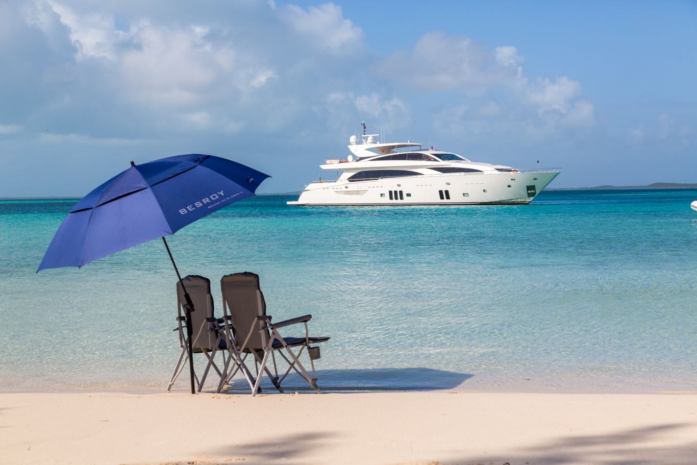 The yacht has plenty of exterior living space to offer. The aft deck is adjacent to the salon through glass doors. Partially shaded, the deck offers an alfresco dining option, additional seating/sun pad and access to the extended swim platform and water toys. Forward, the yacht boasts a more intimate double sun pad.
