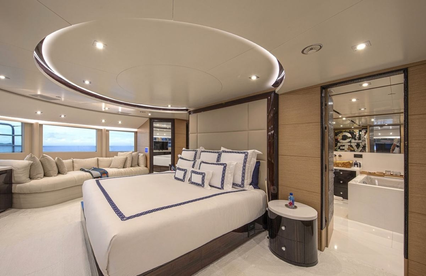 SUR LA MER has several spaces for entertaining on each deck. Her indoor dining area on the upper deck is elegant and easily converts into an outdoor space, thanks to retractable glass walls.