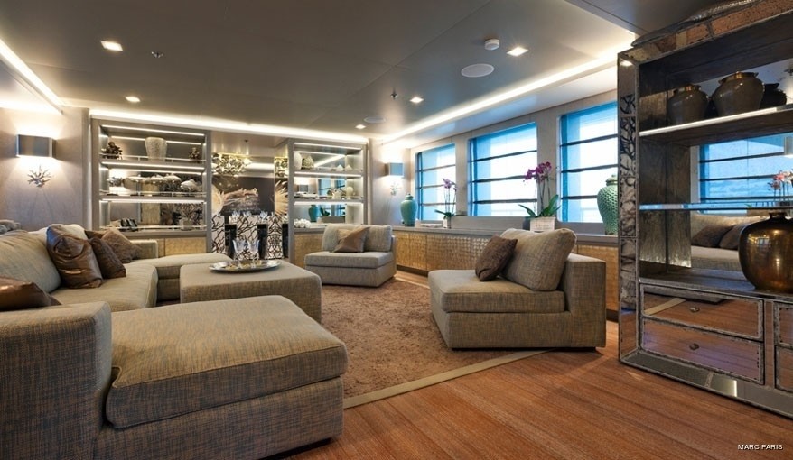 The main deck of motor yacht LIBERTY has large corridors with the main saloon encircled by a continuous panoramic window that opens through the wide sliding doors to the main deck aft.