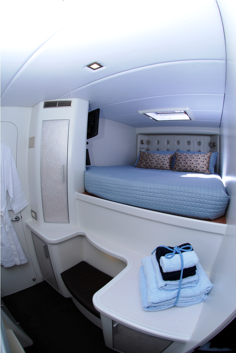 Kupe’s external layout offers a large fishing platform at the stern between hulls with unencumbered access to side and foredecks for the fishermen. The elevated lounge areas in the large cockpit make a great place for viewing the prize catch of the day.